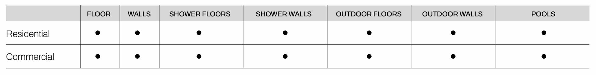 | Application: Commercial, Residential, Floor, Walls, Shower wall, Outdoor Floors, Pools, Wall & Shower wall, Outdoor Walls |